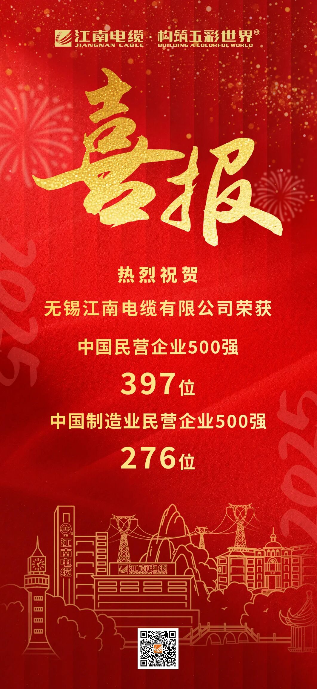 【喜報】江南電纜榮獲2025中國民營企業(yè)500強、中國制造業(yè)民營企業(yè)500強!