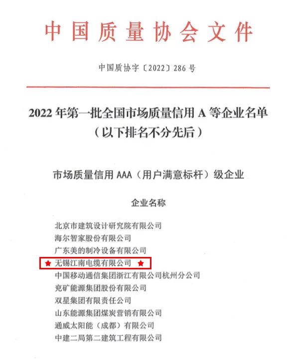 Recently, theChina Association for Quality announced the announcement of the list of thefirst batch of national market quality credit A and other enterprises in 2022.Jiangnan Cable successfully passed the re evaluation, and won the list of"AAA (benchmark for user satisfaction) enterprises in market qualitycredit" with excellent results!